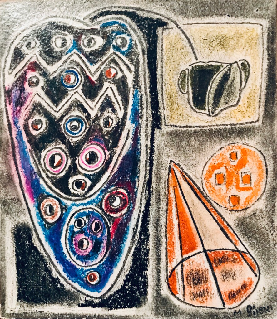 Ma nello stesso periodo, a dimostrazione di come fosse poliedrico ed aperto, disegna su un piccolo cartone con pastelli e matite questa natura morta che invece è piena di colori, ma anche di segni che smontano i vari oggetti, ricostruendoli poi attraverso tratti decisi e quasi geometrici.
